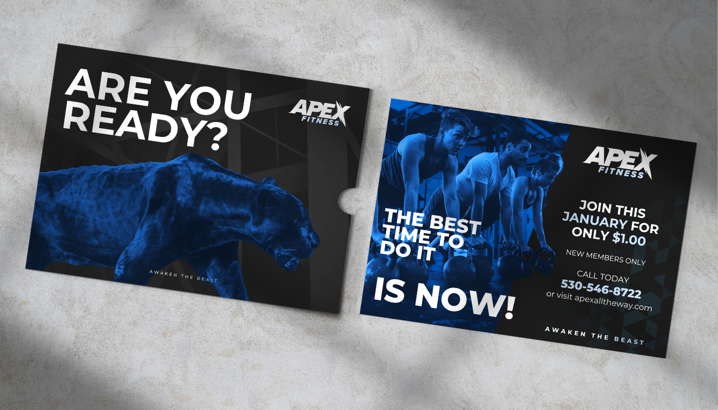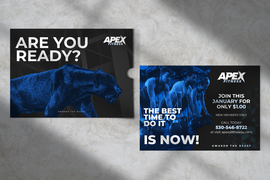Using the powerful and ferocious visuals of natural predators, Apex Fitness is a brand that respects tenacity, determination, and grit. It is all about pumping iron and pushing limits: no coddling, no laziness, no excuses. The designs created for Apex Fitness feature strong contrast and a multitude of textures that speak to the hardness of the members. The dark backgrounds and black and white photography ground the brand in strength and confidence, while the light blue accent uplifts with grace and calm assurance.
